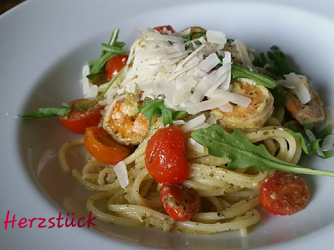 Spaghetti mit Garnelen, Kirschtomaten, Ruccola und Minzpesto